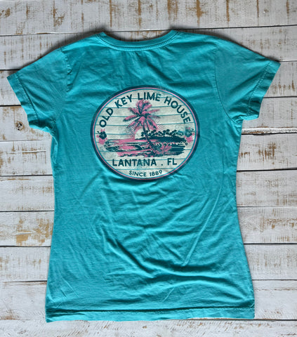 Short Sleeve Ladies Shiplap Palms T-shirt, Island Blue